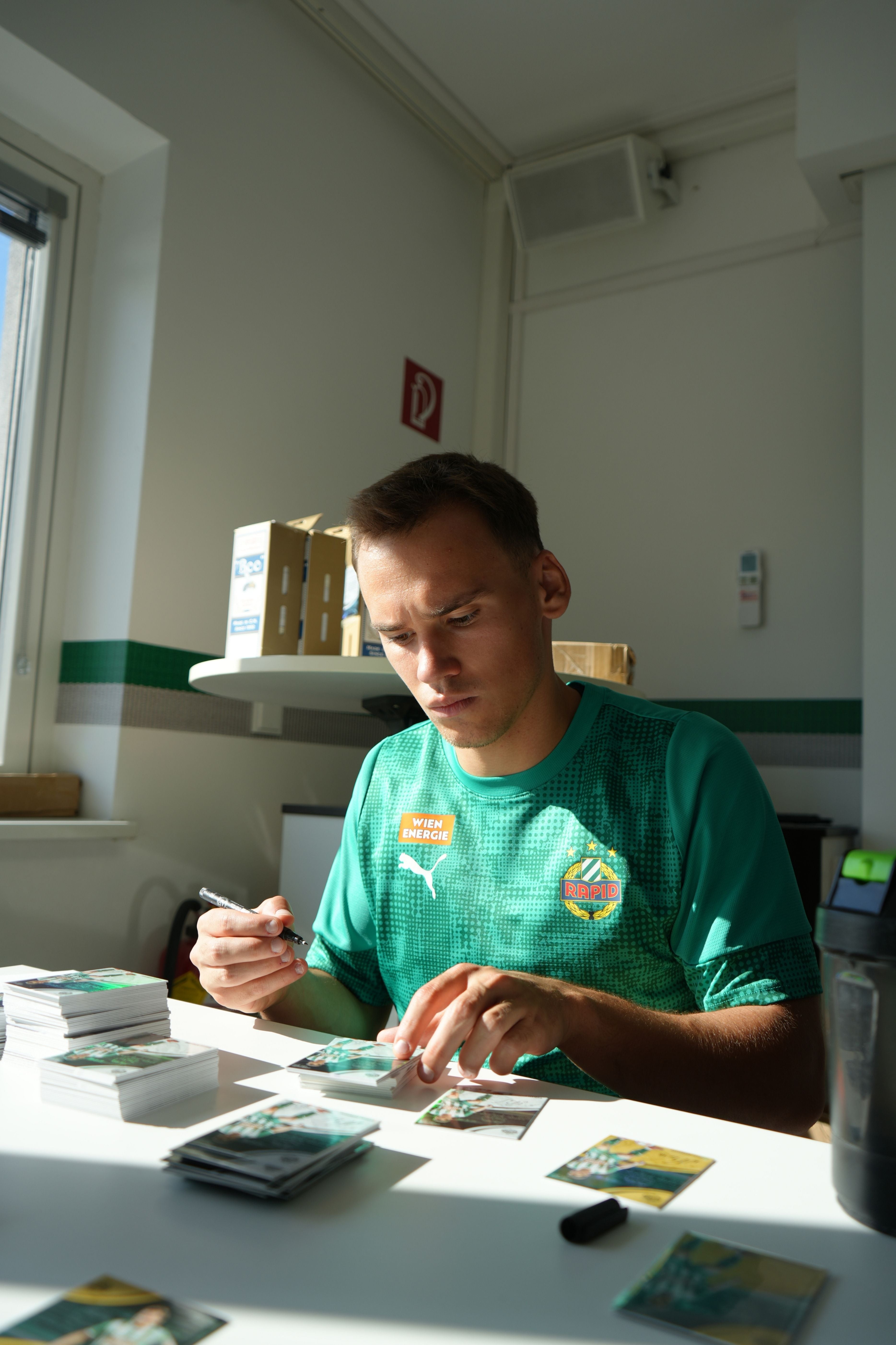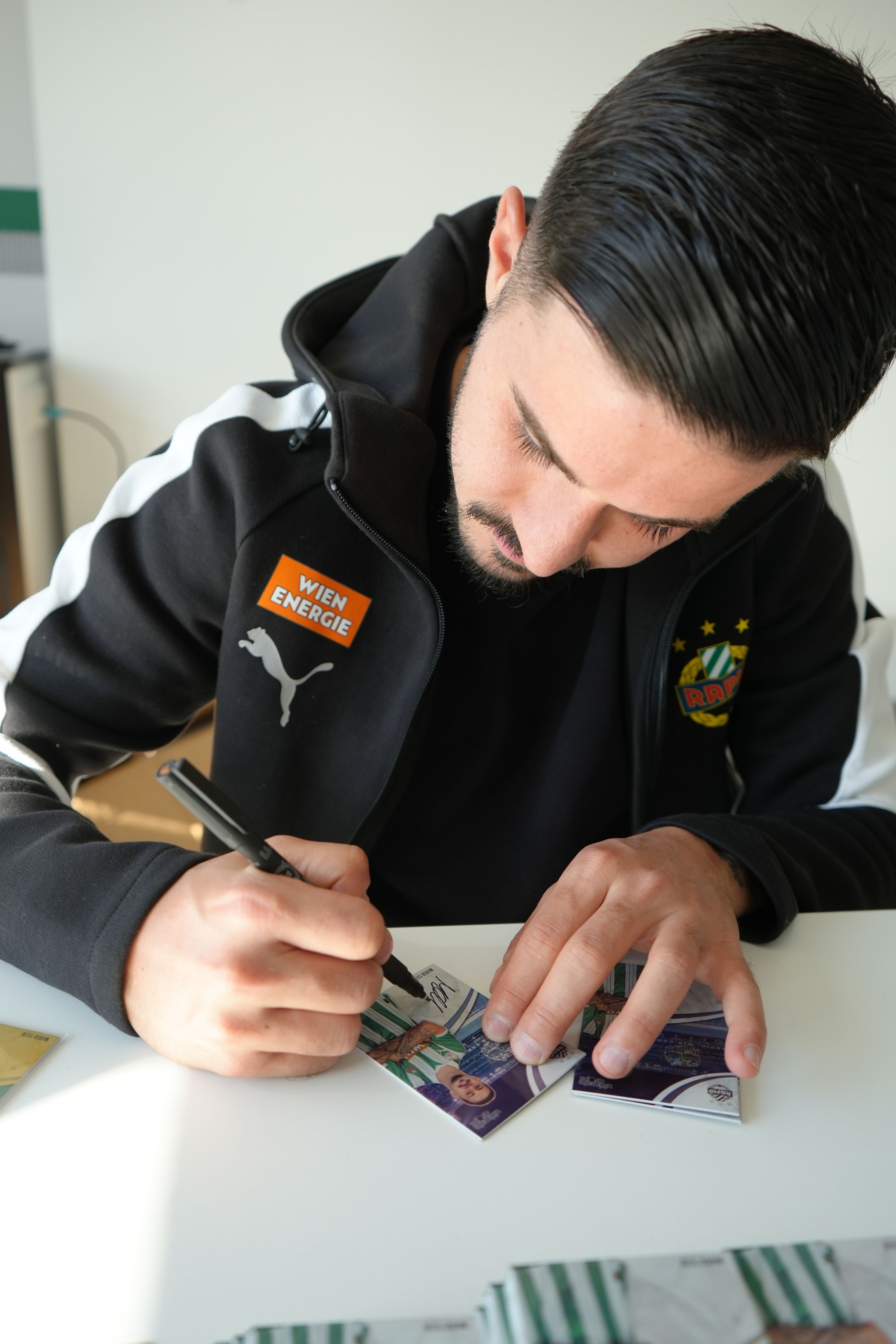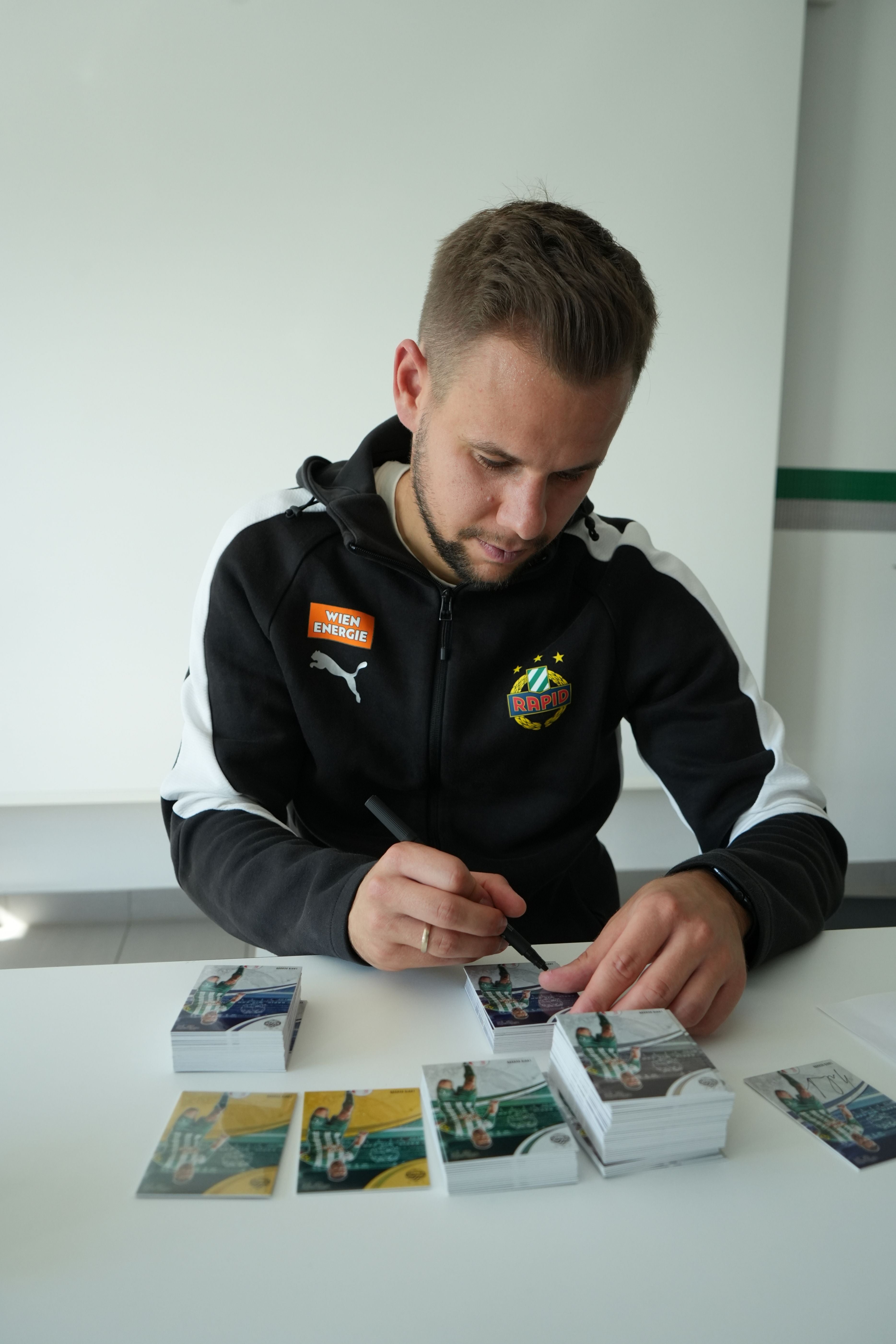 Caja oficial de cromos del SK Rapid con cromos de fútbol que incluyen a las estrellas de la temporada 25/26 y leyendas especiales de la historia del club, con un autógrafo garantizado en cada cromo por caja.