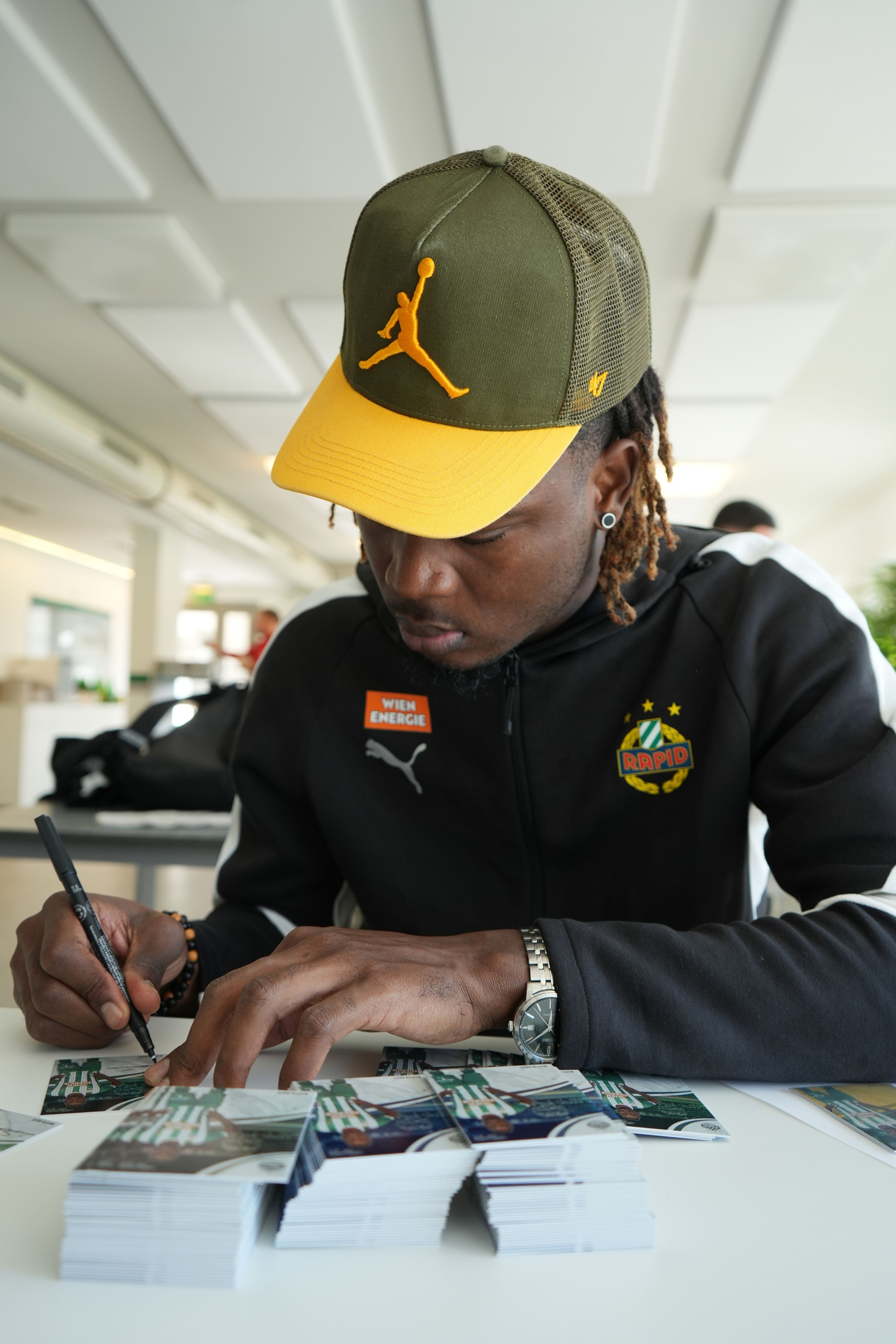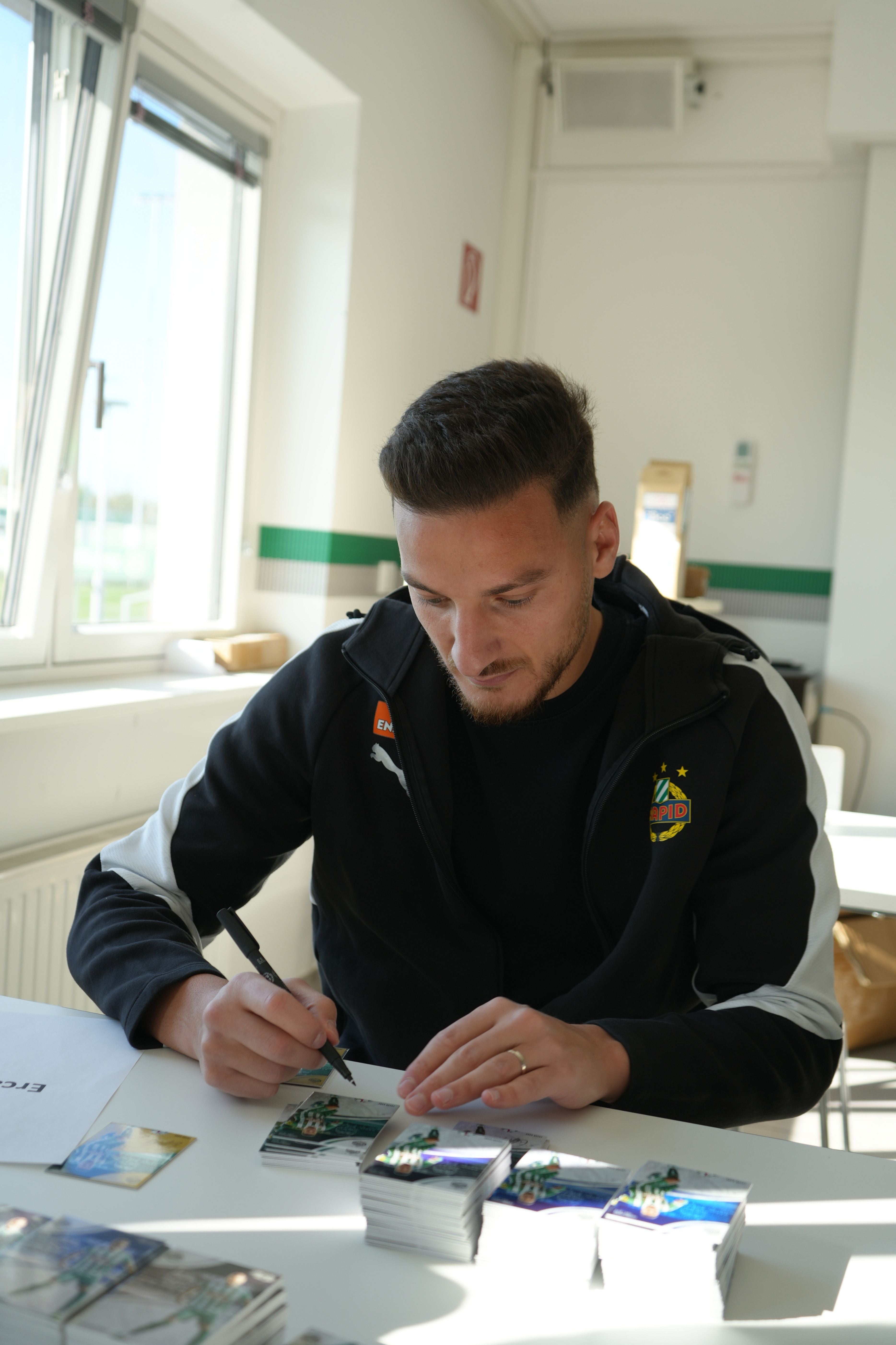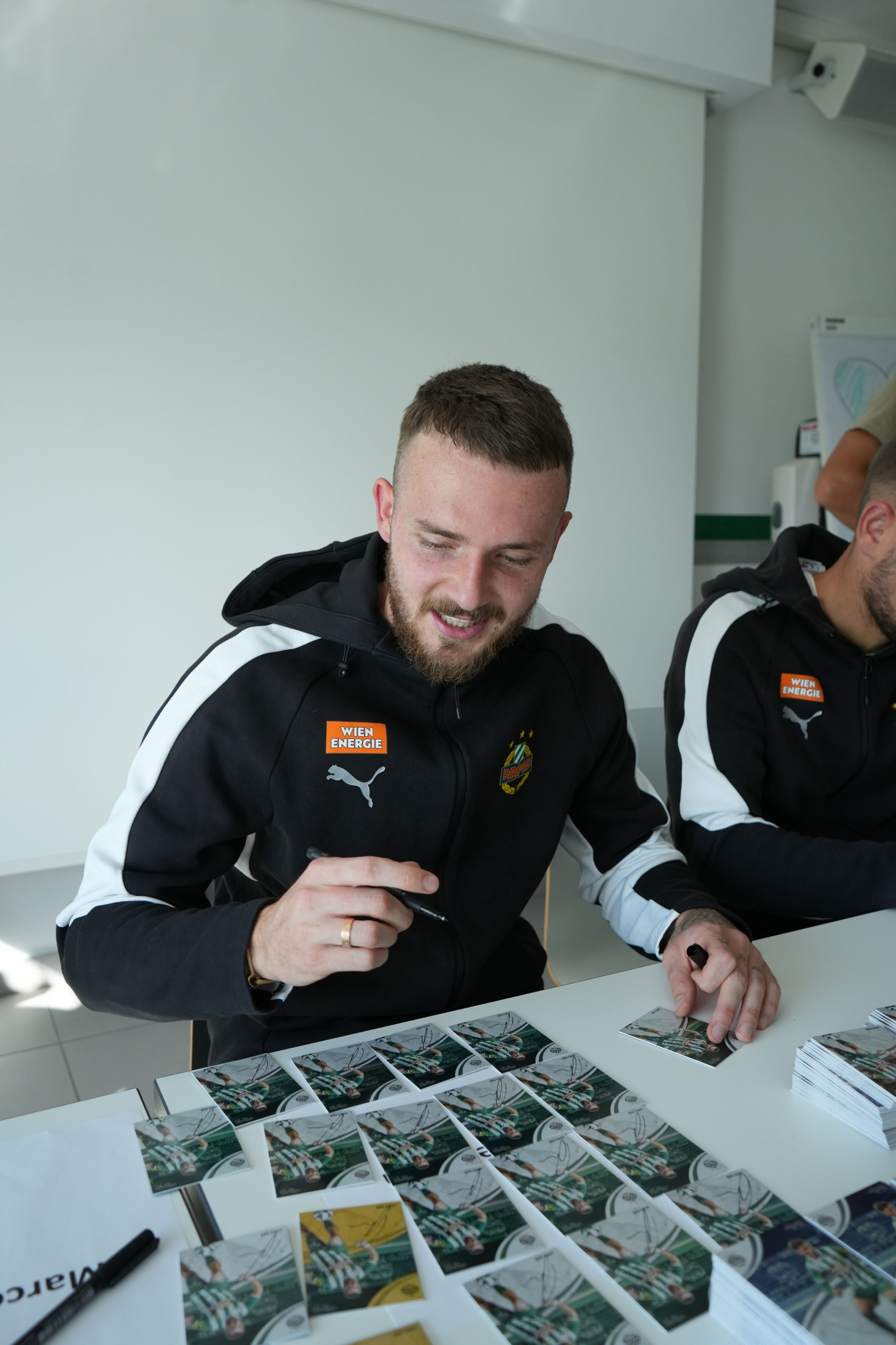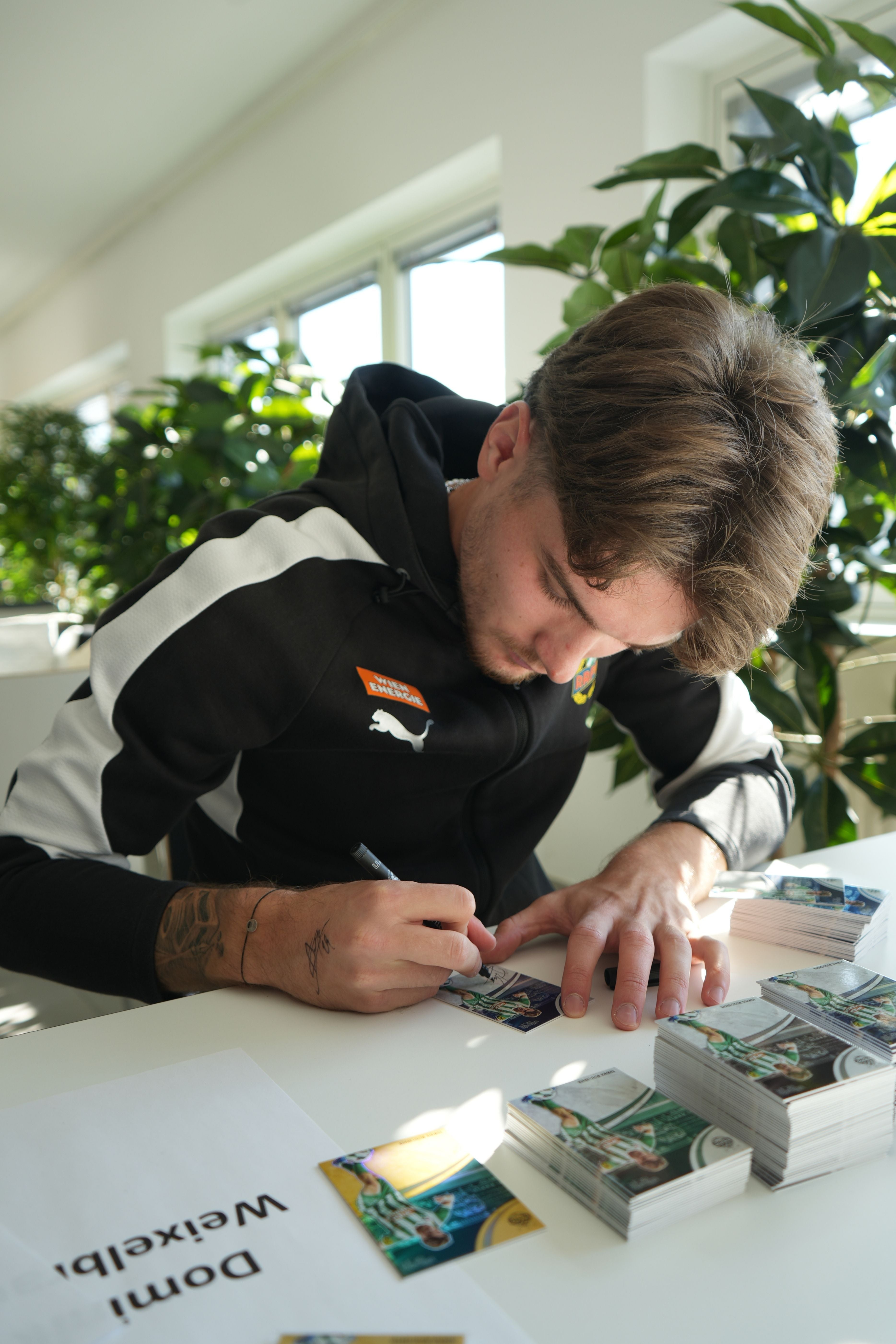 Caja oficial de cromos del SK Rapid con cromos de fútbol que incluyen a las estrellas de la temporada 25/26 y leyendas especiales de la historia del club, con un autógrafo garantizado en cada cromo por caja.