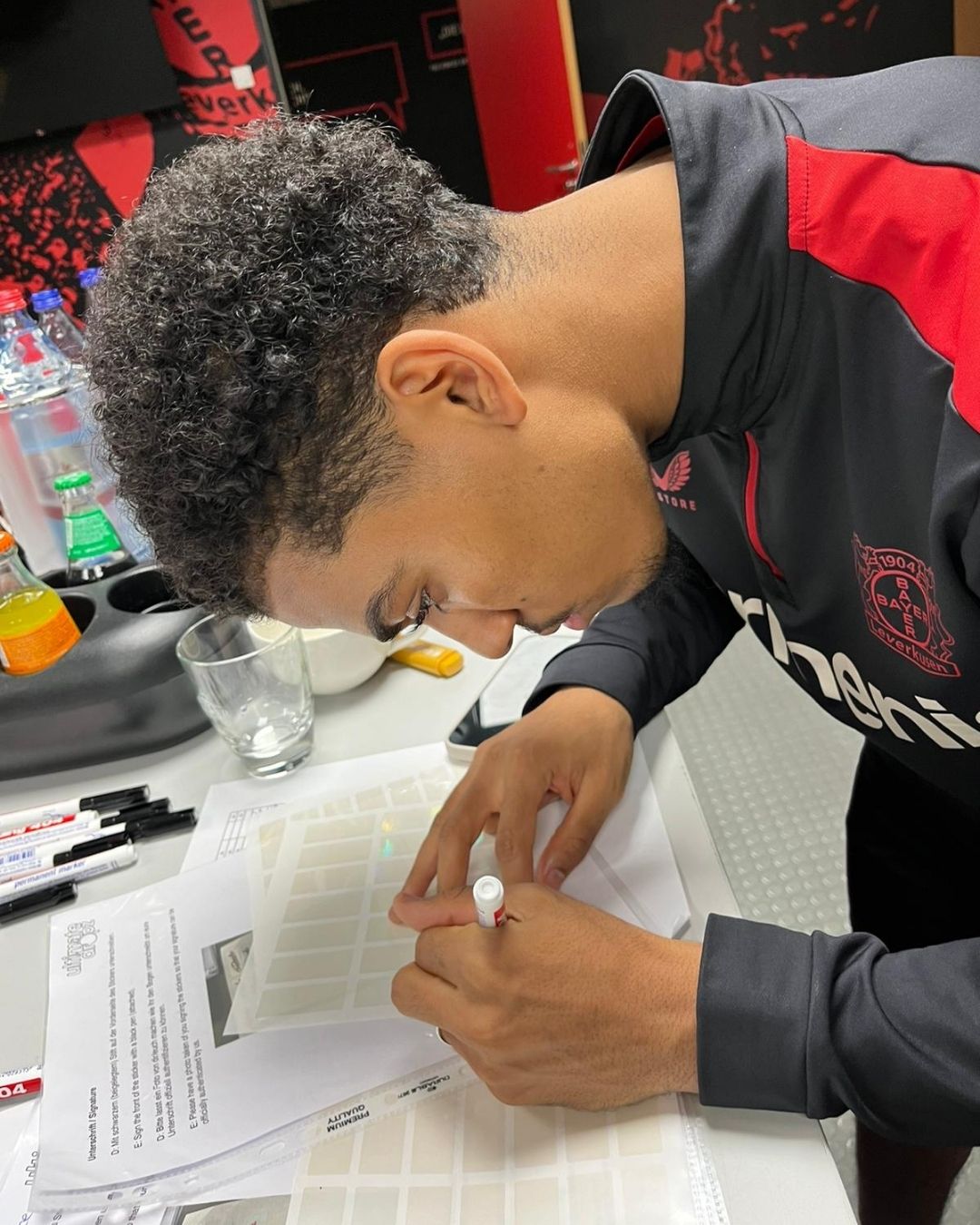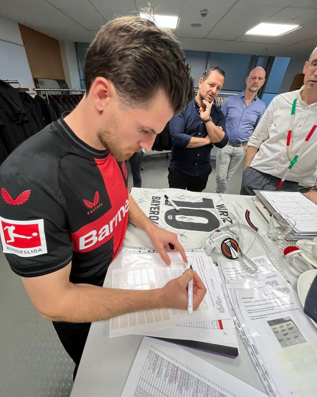 Die offizielle Bayer 04 Leverkusen Fußball-Sammelkartenbox zur Feier des historischen ersten deutschen Meisterschaftssiegs des Vereins mit aufgedruckten Unterschriften und getragenen Erinnerungskarten der Spieler, die Geschichte geschrieben haben.