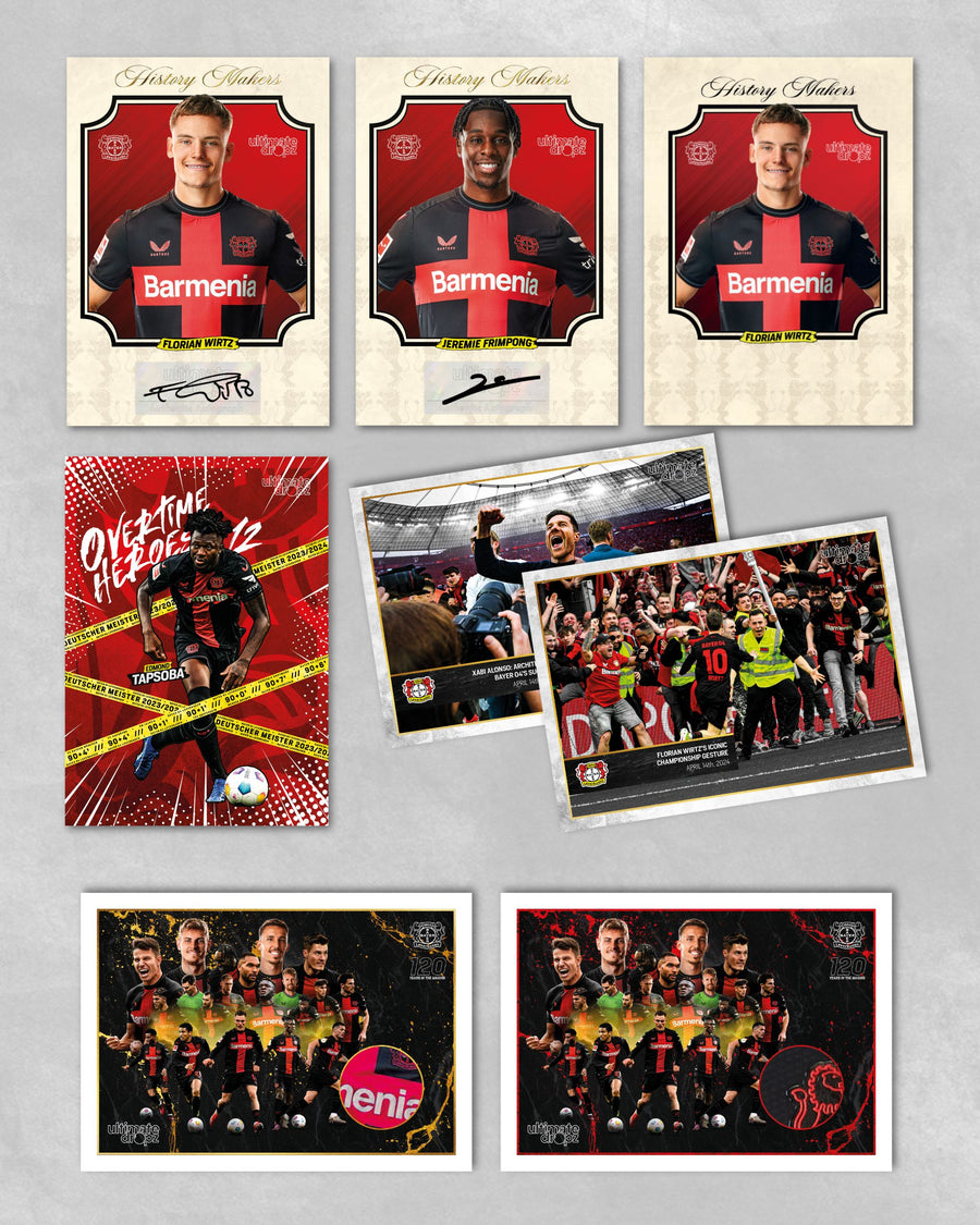 Offizielle Bayer 04 Leverkusen Sammelkartenbox mit Fußball-Sammelkarten der historischen Persönlichkeiten der Saison 23/24, die den ersten deutschen Meistertitel des Vereins feiern.