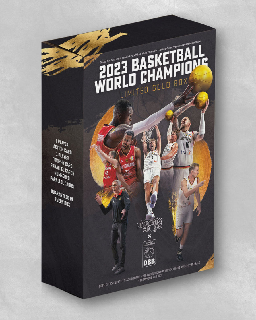 Die erste offizielle DBB-Basketball-Sammelkartenbox zur Feier des historischen ersten Weltmeisterschaftssiegs überhaupt mit einzigartigen, im Spiel getragenen Erinnerungskarten