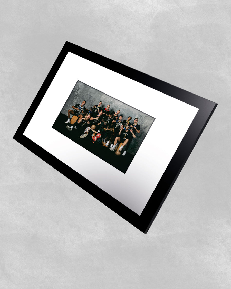 Exclusive limited edition matted & framed print of the DBB in collaboration with photographer Philipp Reinhard, who was the first to photograph the world champions after their arrival in Germany – together with the trophy from the German national basketball team's first ever World Cup victory.