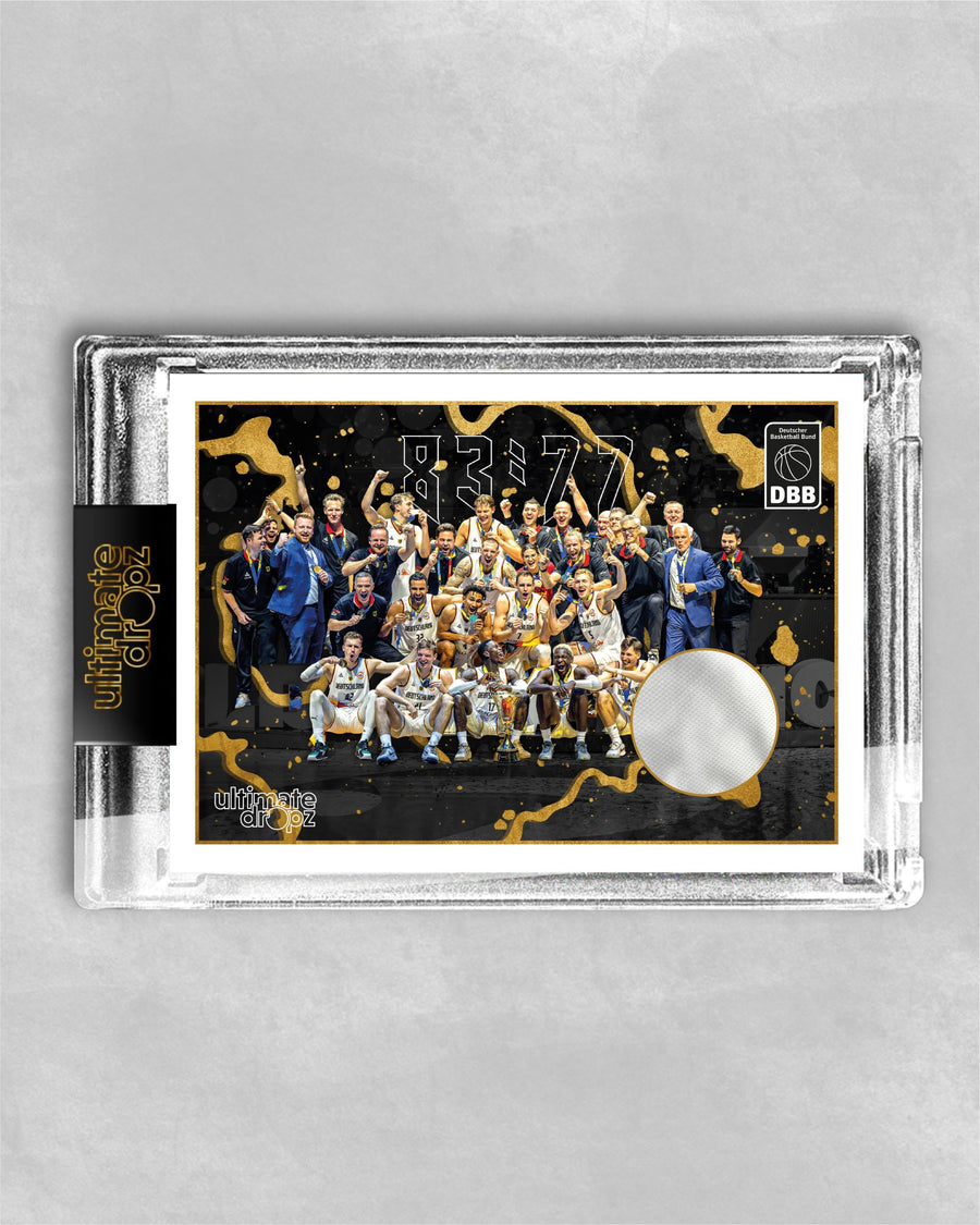 Exclusive match-worn Memorabilia basketball Trading Card, with an incorporated piece of shorts by Daniel Theis from the 2023 World Cup final against Serbia - Germany's historic first World Cup title. A real must-have for basketball fans and collectors.