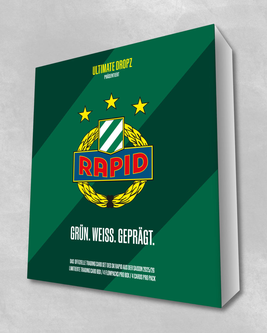 The first official SK Rapid football trading card box ever featuring stars from the 2025/26 season and special club legends like Hans Krankl, Steffen Hofmann or Guido Burgstaller.